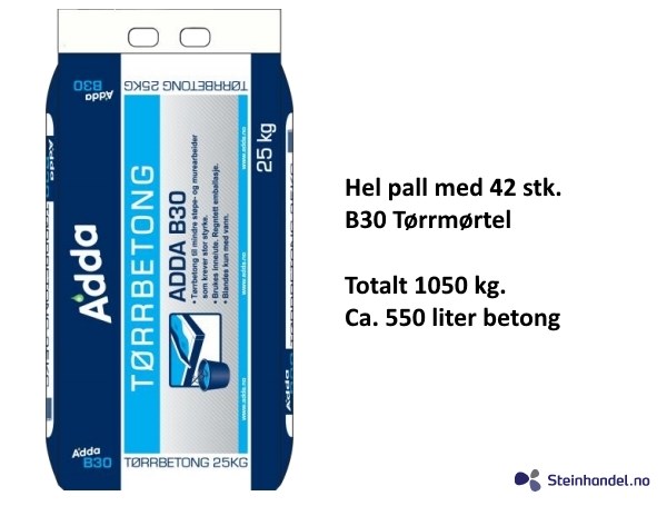 Pall med 42 stk. B30 25KG Tørrbetong sekker (totalt 1050kg). Gir ca. 550 liter ferdig betong. Kan benyttes til støping i forskalingsblokker, montering av kantstein med mer.