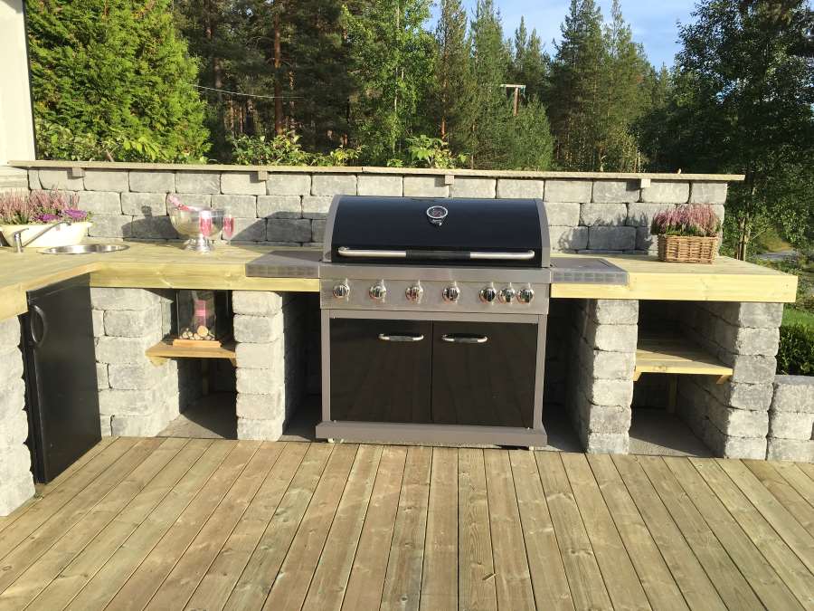 Flott utekjøkken med integrert blomsterbed og benk. Utekjøkkenet er laget i Herregård Mur Gråmix i kombinasjon med tre. Det er også benyttet belysning for å gjøre det stemningsfullt kveldstid.